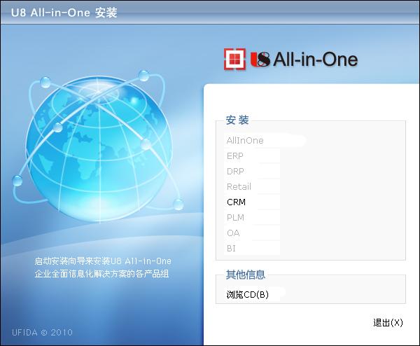 可以看到,这个All-in-One实际上就是那几个产品打包在一起的一个大安装包而已:如果您买这个All-in-One时买了CRM,您就可以在上面点击“CRM”安装CRM;如果买了U8,就可以点击上面那个“ERP”,就可以给您装上个U8;如果买了OA,就可以点击上面那个“OA”,就可以给您装上用友致远的A6……